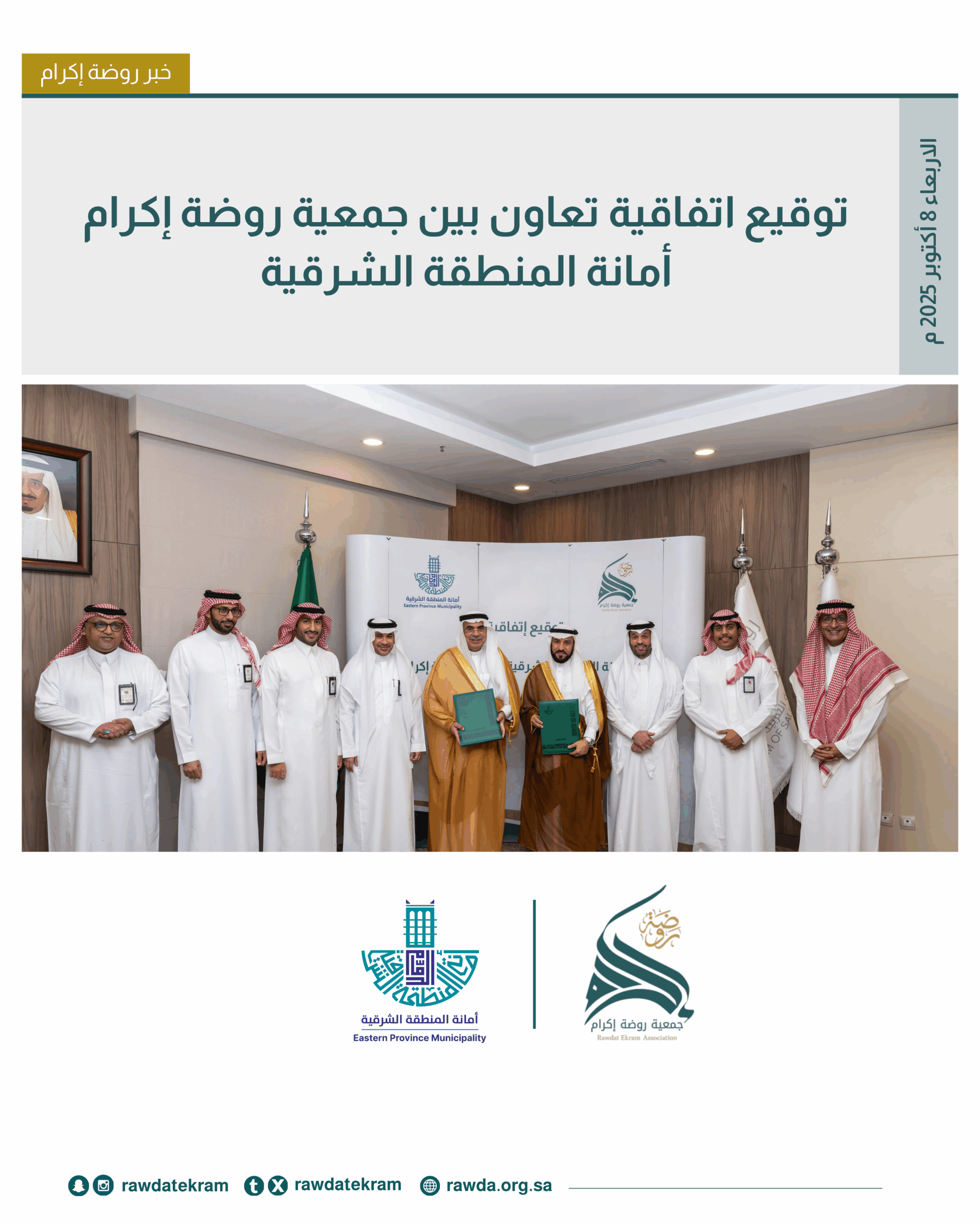 وقّعت جمعية روضة إكرام، اليوم الأربعاء ٨ أكتوبر ٢٠٢٥، مذكرة تفاهم وتعاون مع أمانة المنطقة الشرقية وذلك بهدف الارتقاء بالخدمات المقدمة في مراكز إكرام الموتى والمقابر الرسمية في المنطقة الشرقية بما يعزز التكامل بين القطاعين الحكومي وغير الربحي ويسهم في تحقيق مستهدفات رؤية السعودية 2030