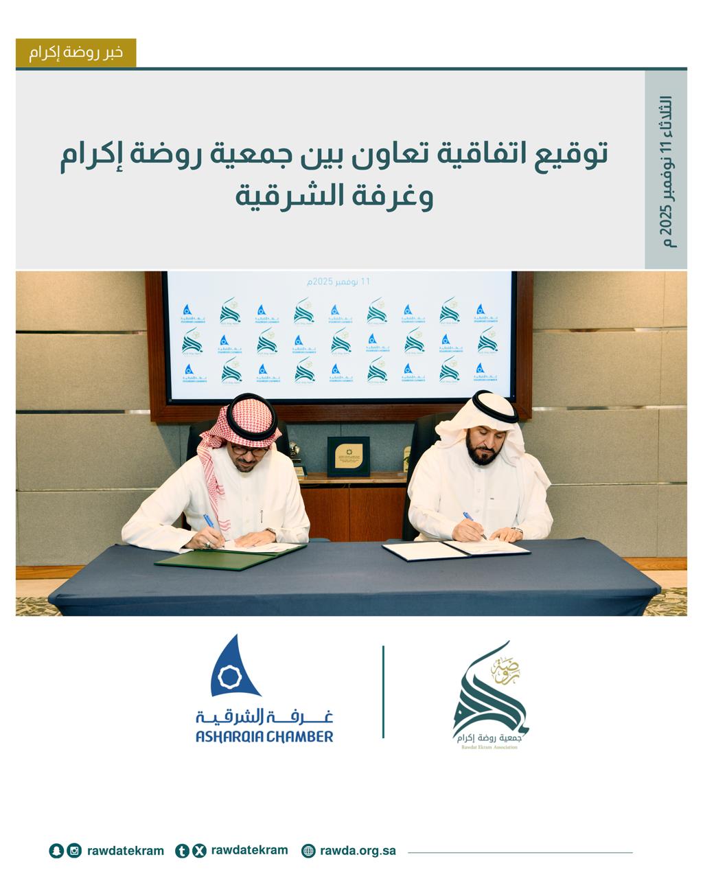وجرى توقيع الاتفاقية في مقر غرفة الشرقية، حيث وقعها من جانب الغرفة رئيس مجلس إدارتها الأستاذ بدر بن سليمان الرزيزاء، ومن جانب الجمعية الأستاذ عبدالحكيم بن حمد العمار الخالدي رئيس مجلس إدارة جمعية روضة إكرام